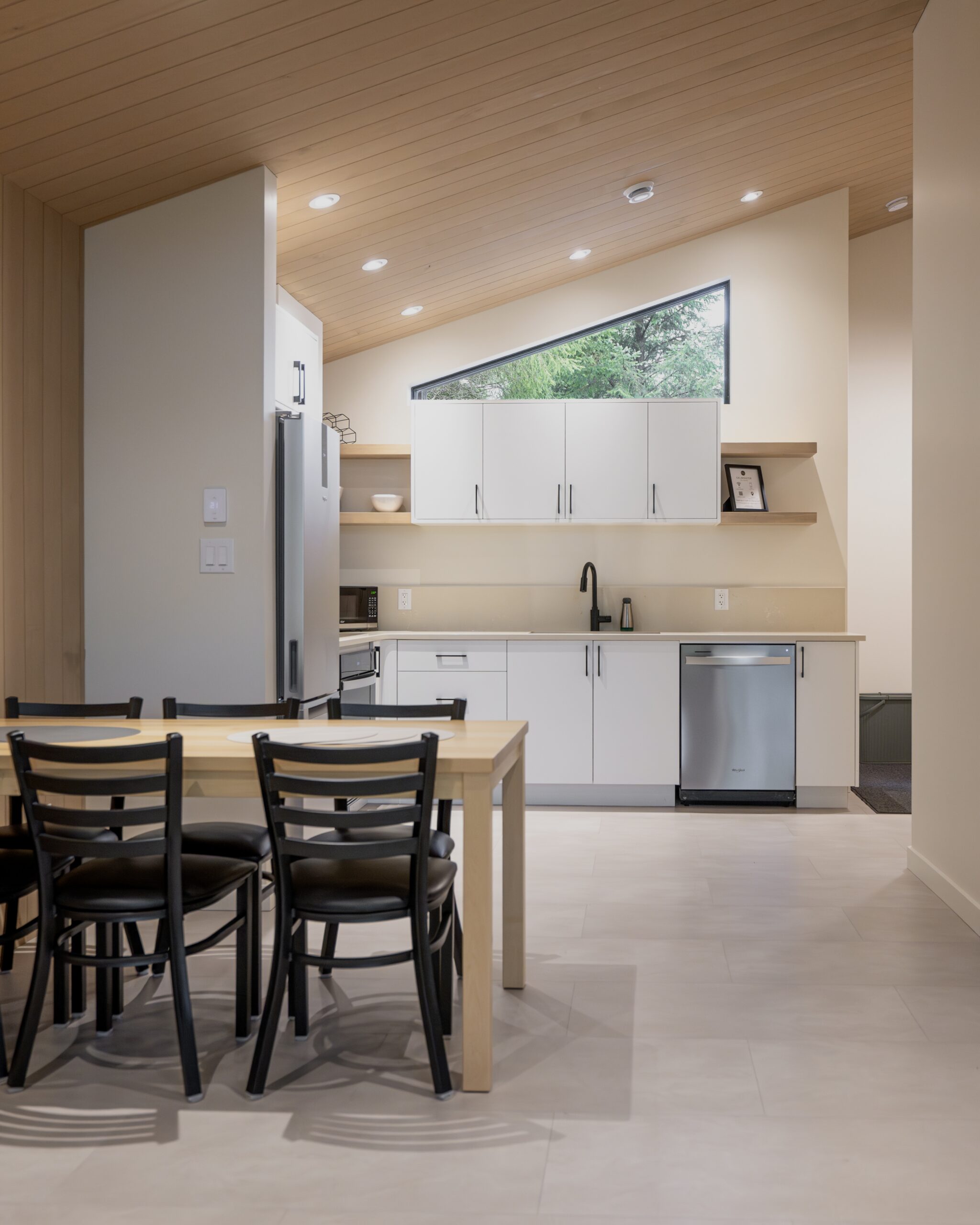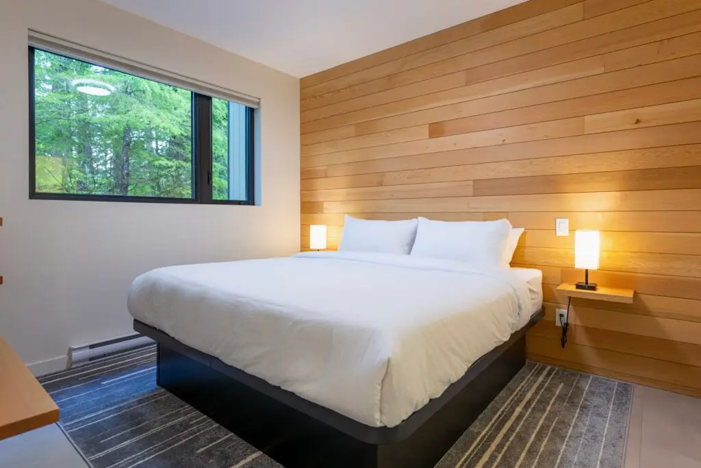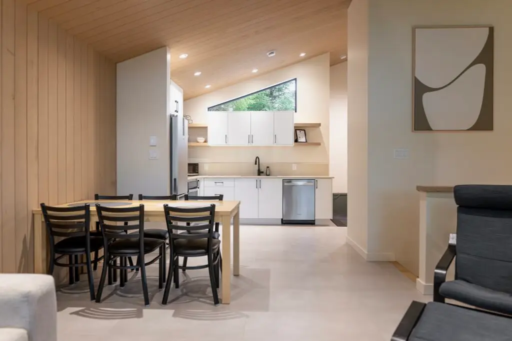 The open-concept kitchen is located alongside the living space and features modern appliances, quartz countertops, and a layout suited for both short and longer stays. It is well stocked for your convenience. The dining table comfortably seats six and looks out into the surrounding forest.
