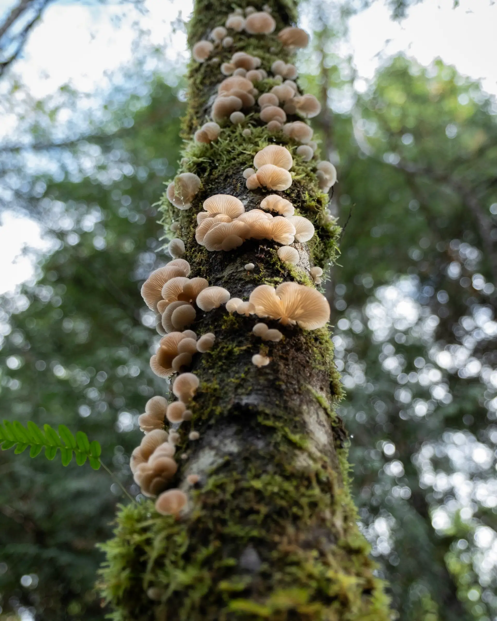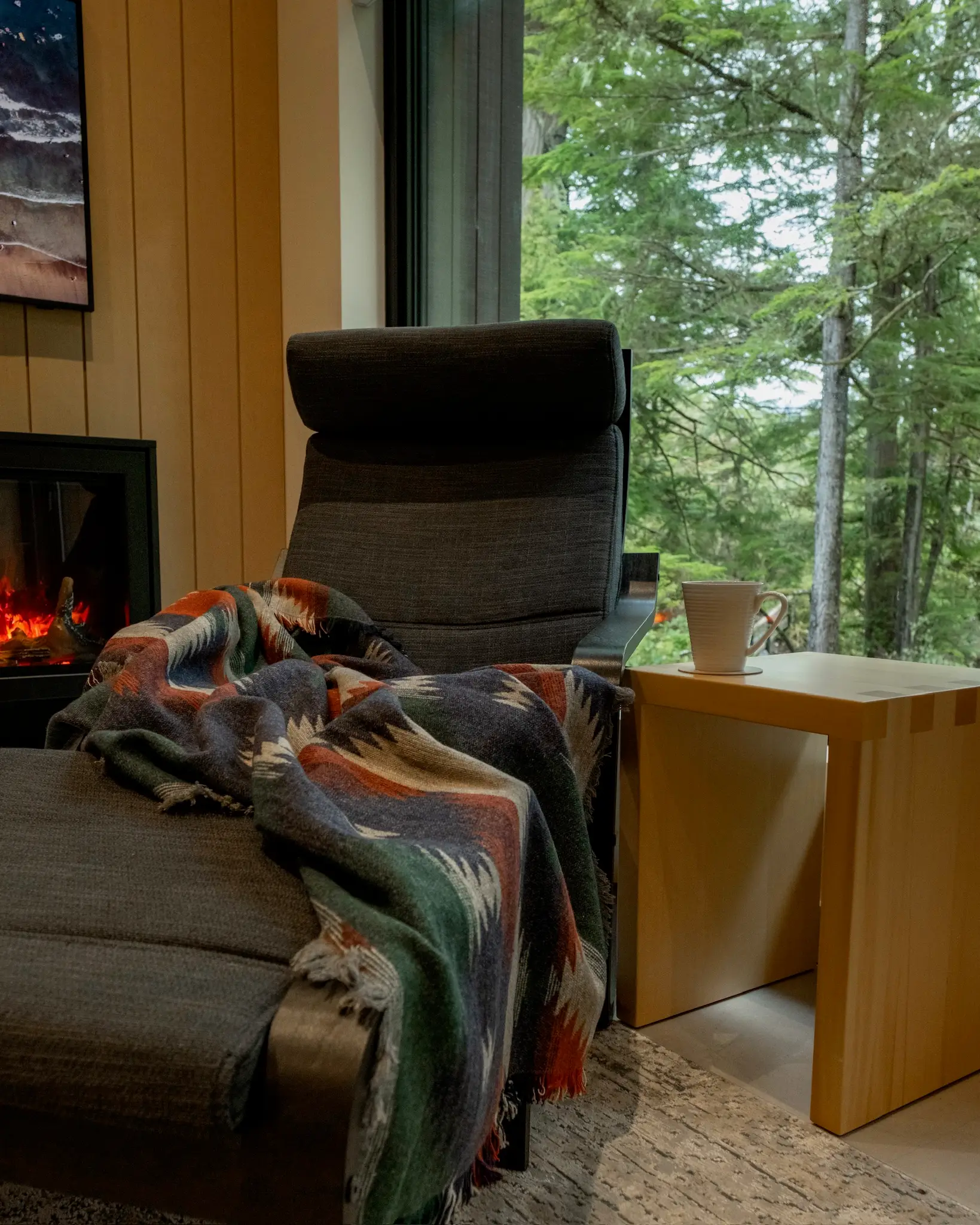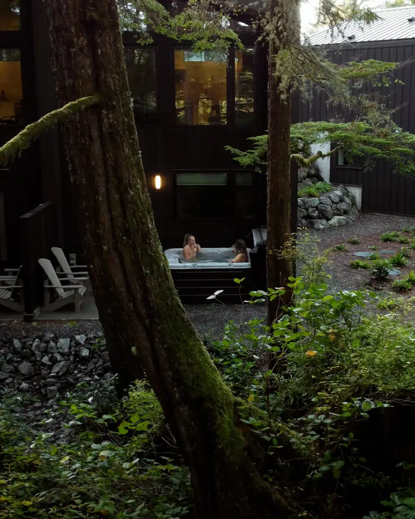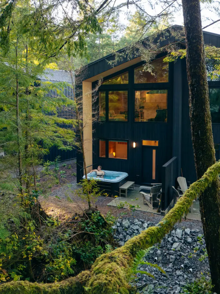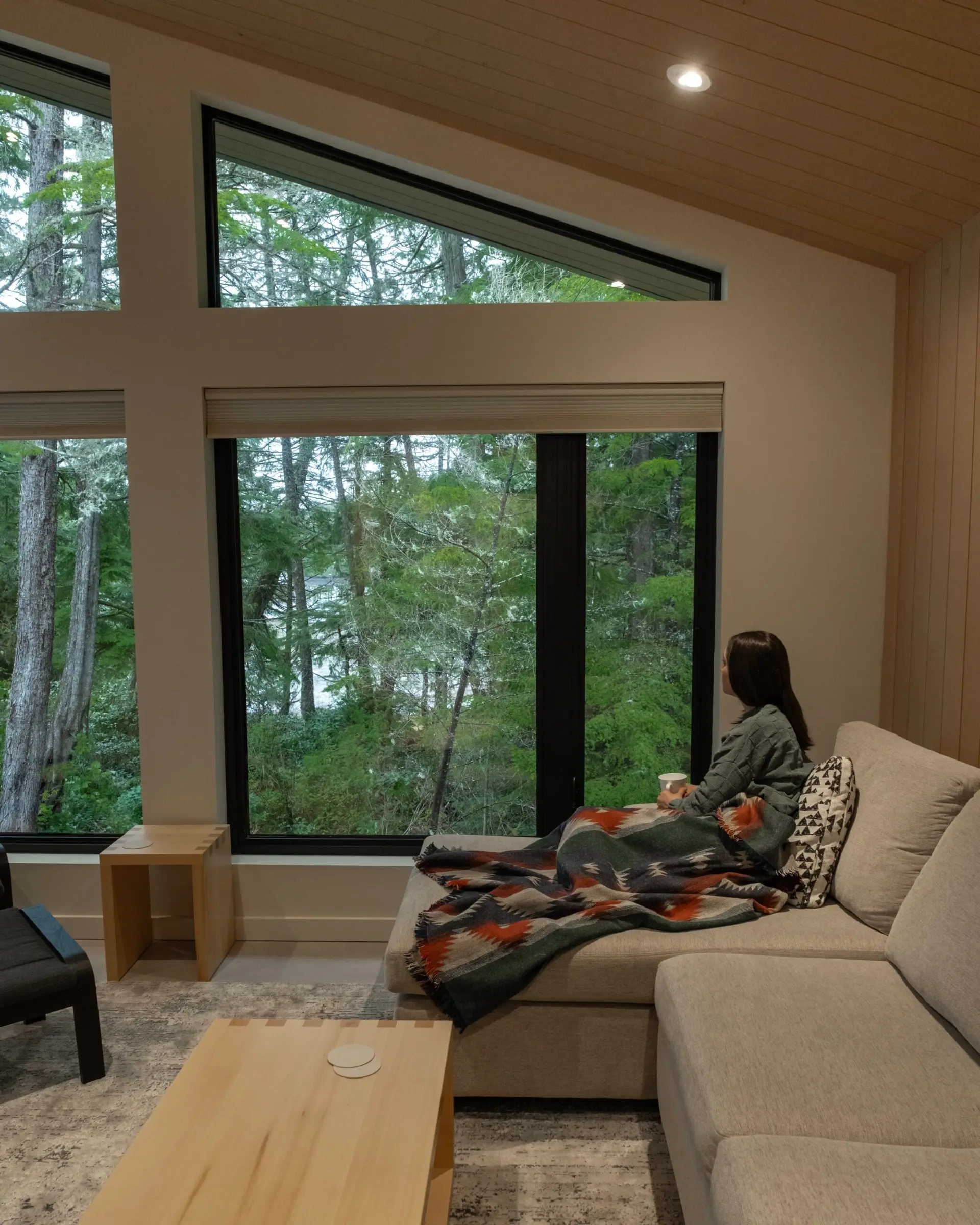 The retreat is tucked away within old-growth forest, surrounded by towering trees. Some cabins offer gentle ocean glimpses toward Spring Cove, while others are fully immersed in greenery, offering a deep sense of privacy and calm.