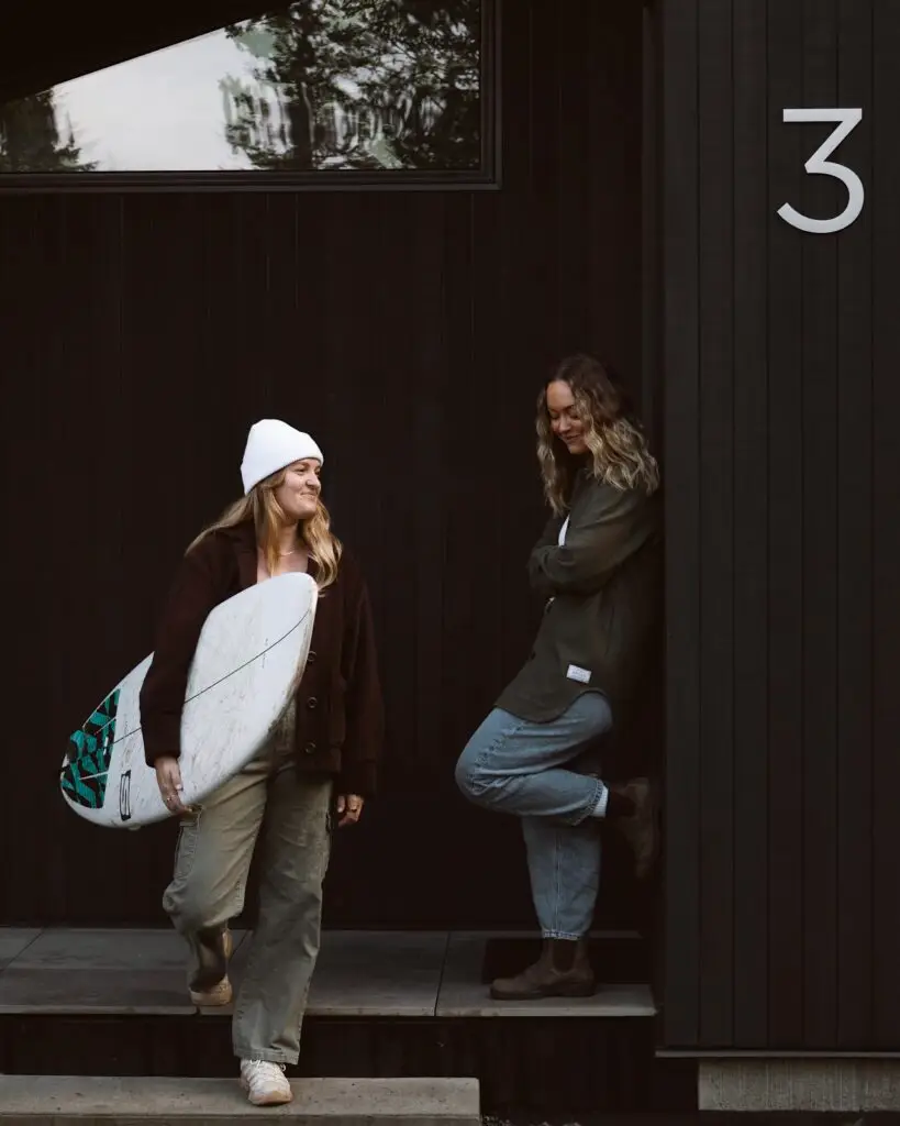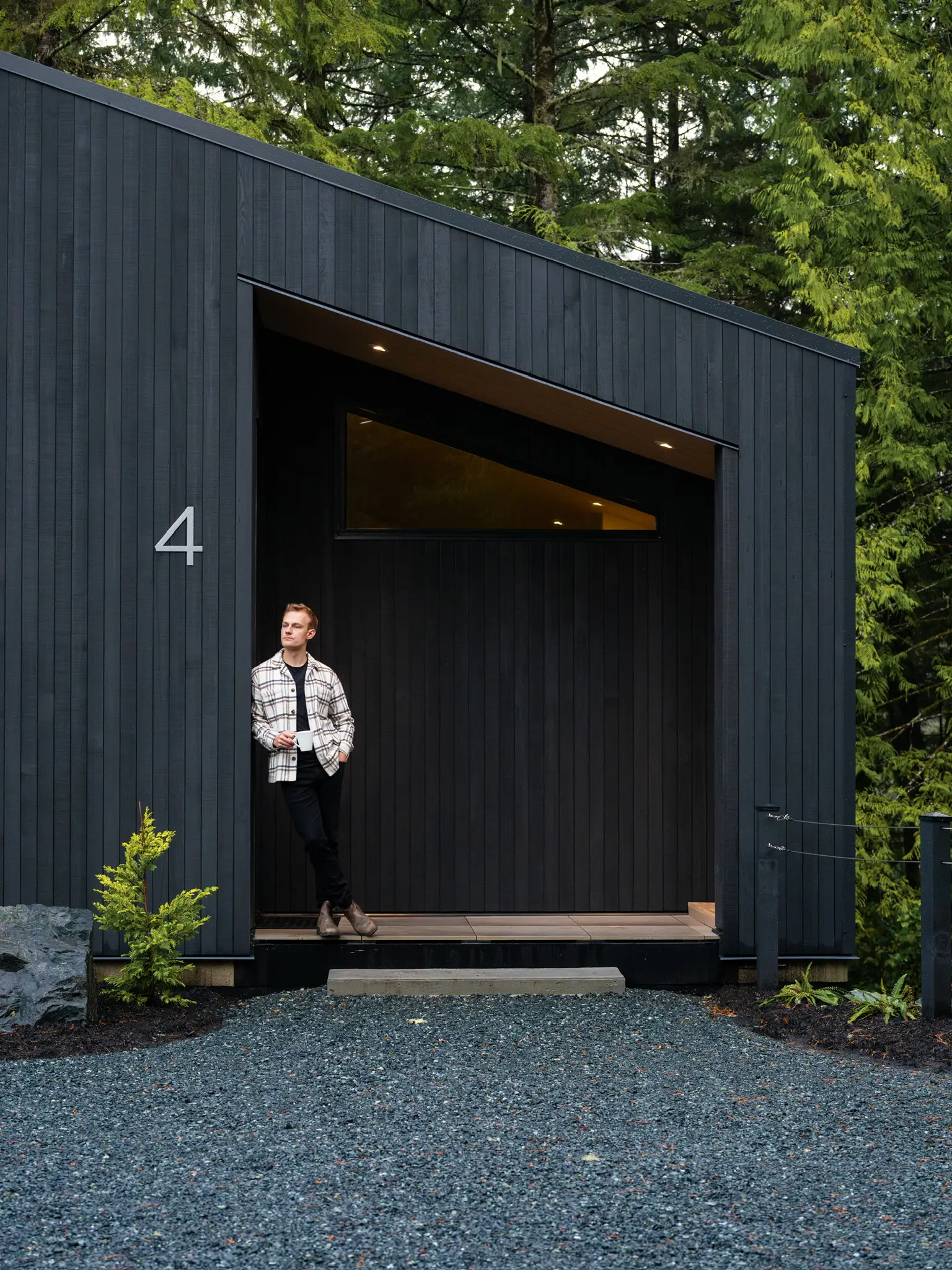 Calmwater Retreat features six modern, thoughtfully designed cabins spread across two levels, balancing clean architectural lines with privacy, and comfort. Natural materials and custom wood details throughout the space add warmth and texture.