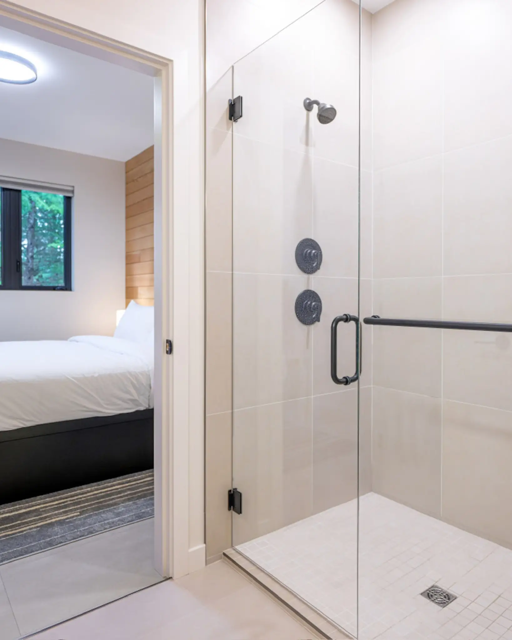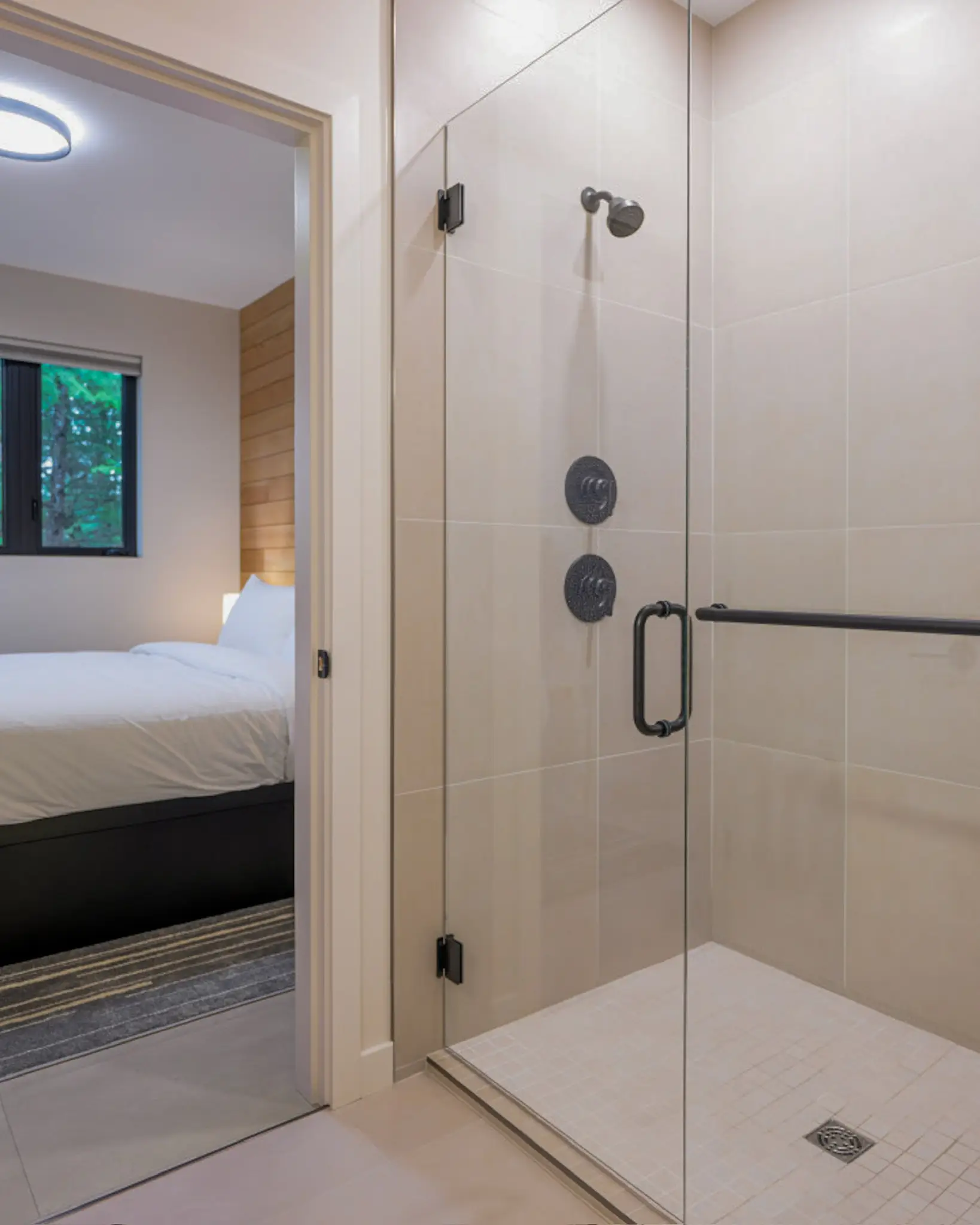 Downstairs, each bedroom is designed as its own retreat. Both king bedrooms feature smart TVs, generous storage, and private ensuite bathrooms. One ensuite includes a walk-in shower, while the other offers a tub/shower combo. Heated bathroom floors provide year-round comfort.